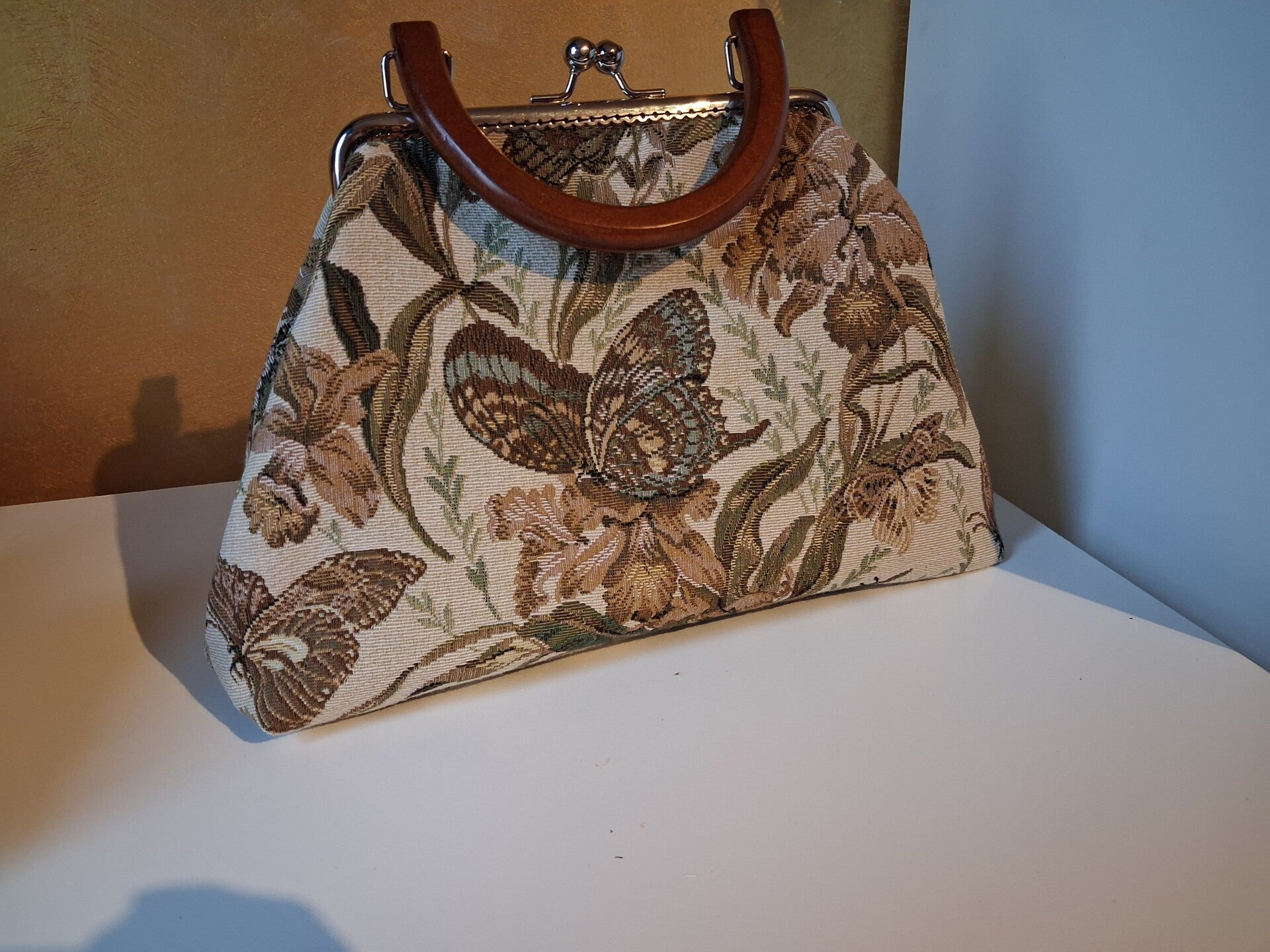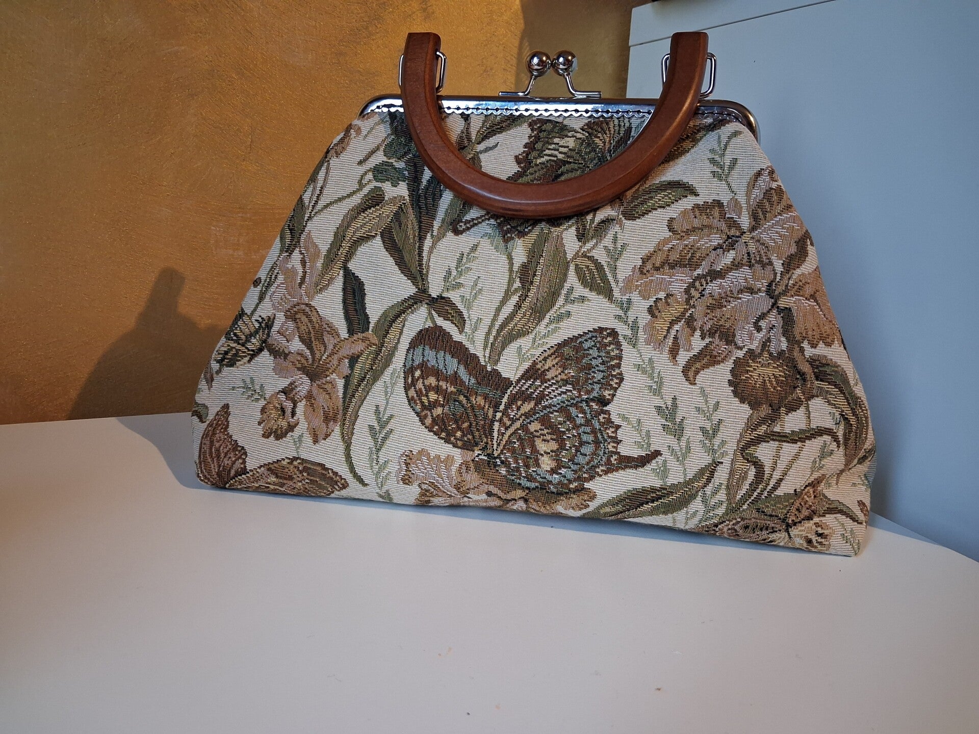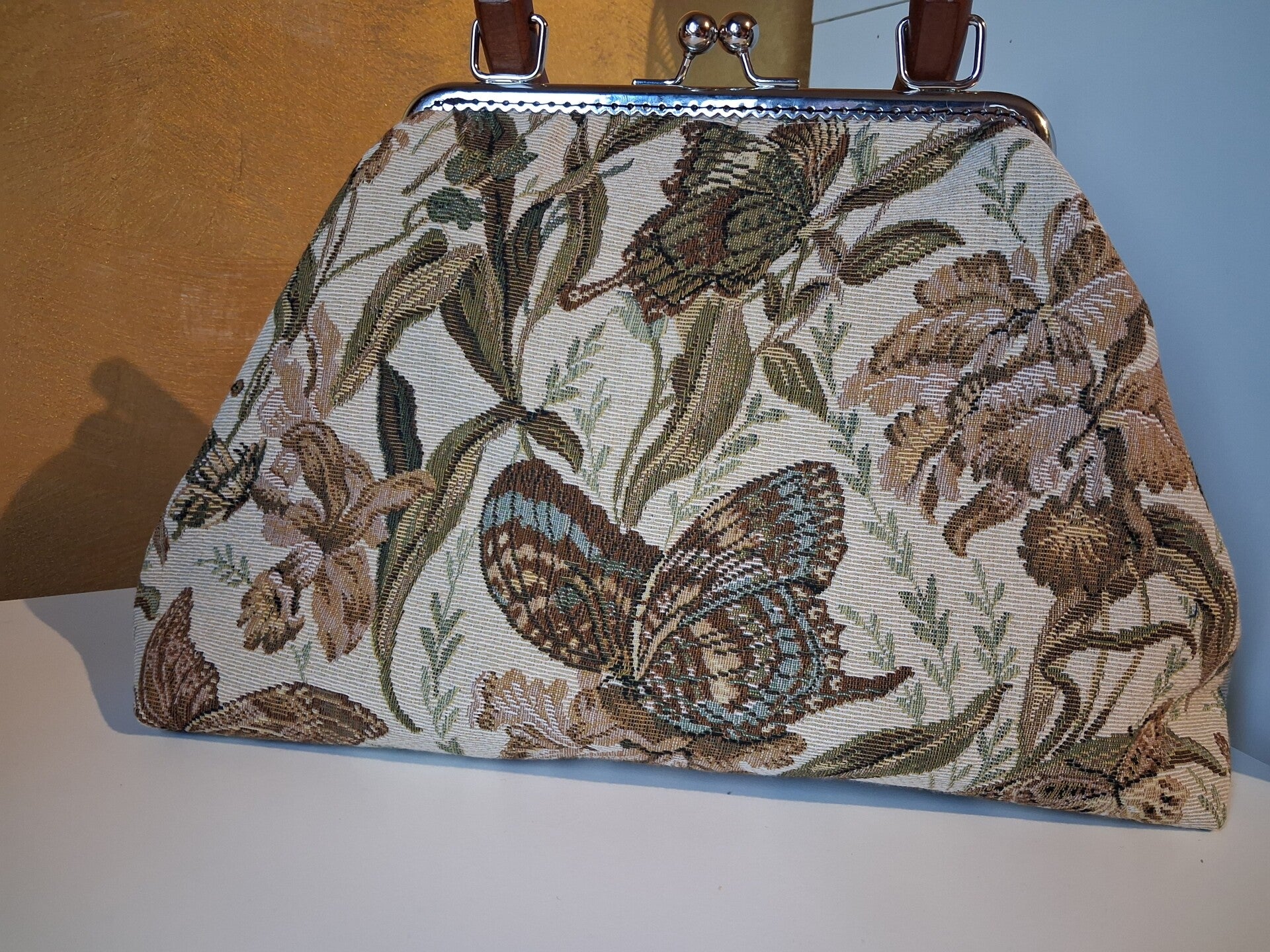 Borsa in tessuto vintage in gobelin di cotone, foderato in rasone color bronzo.