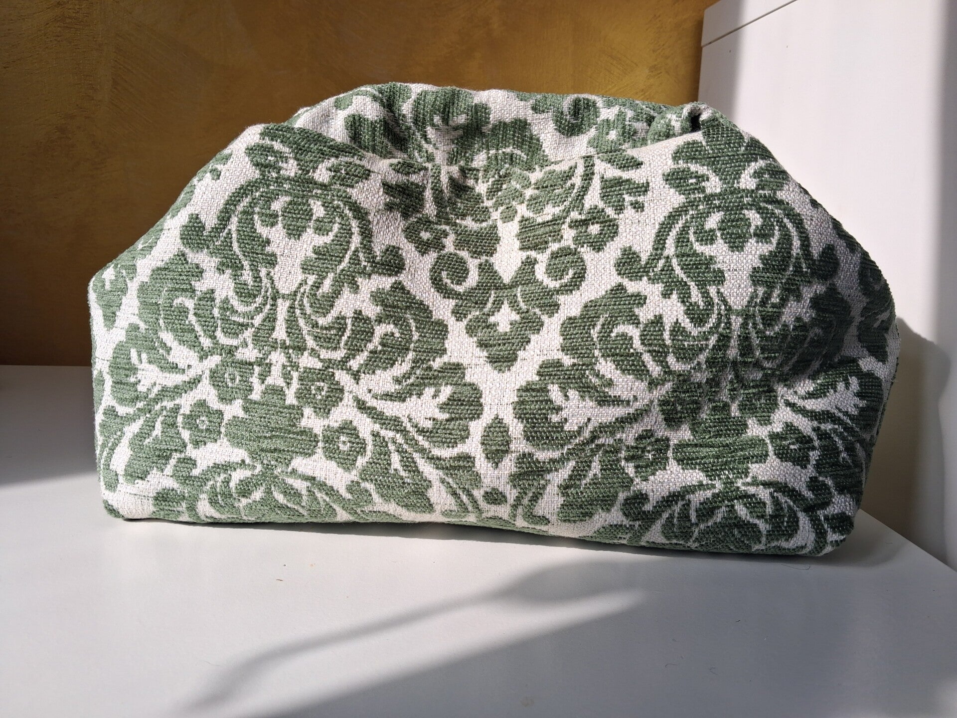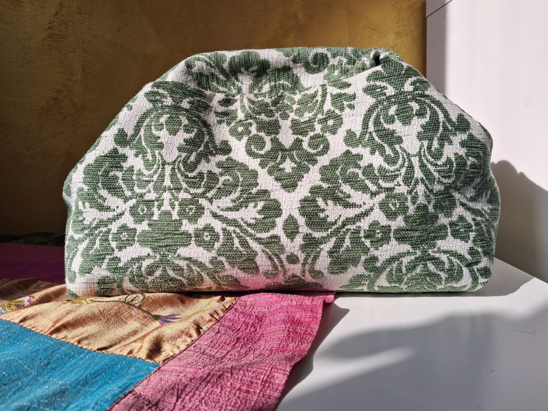 Tessuto damascato verde su base avorio, fodera beige con tasca interna.