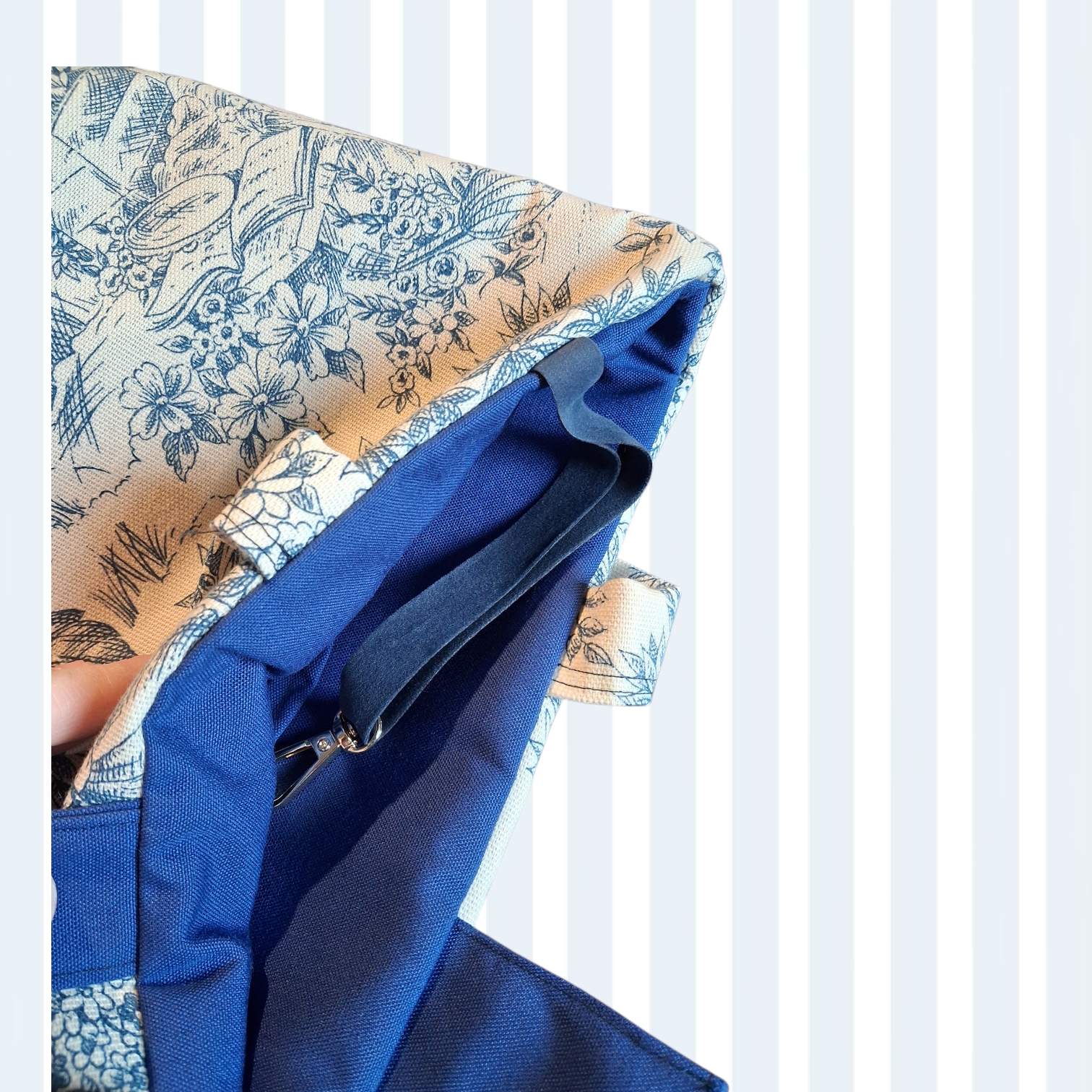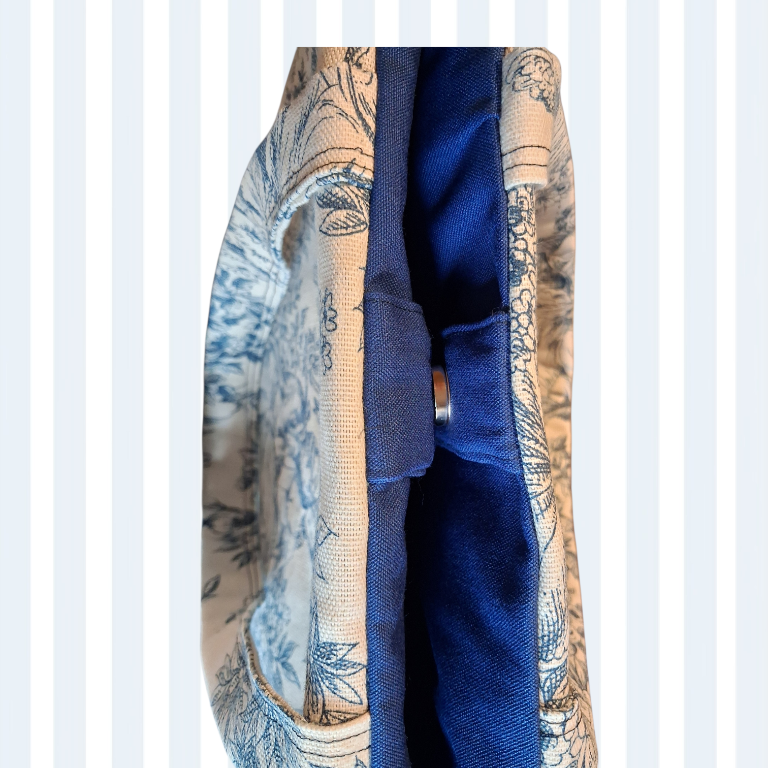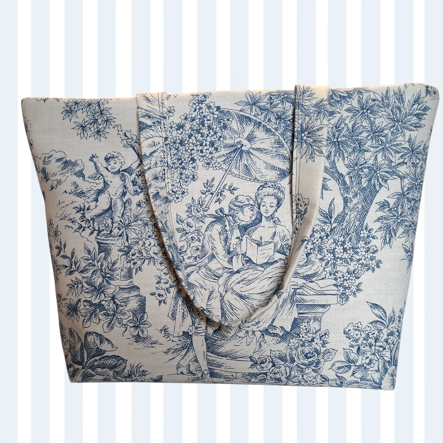 Borsa con manici in tessuto, fantasia Toile de Jouy base avorio e Blu.