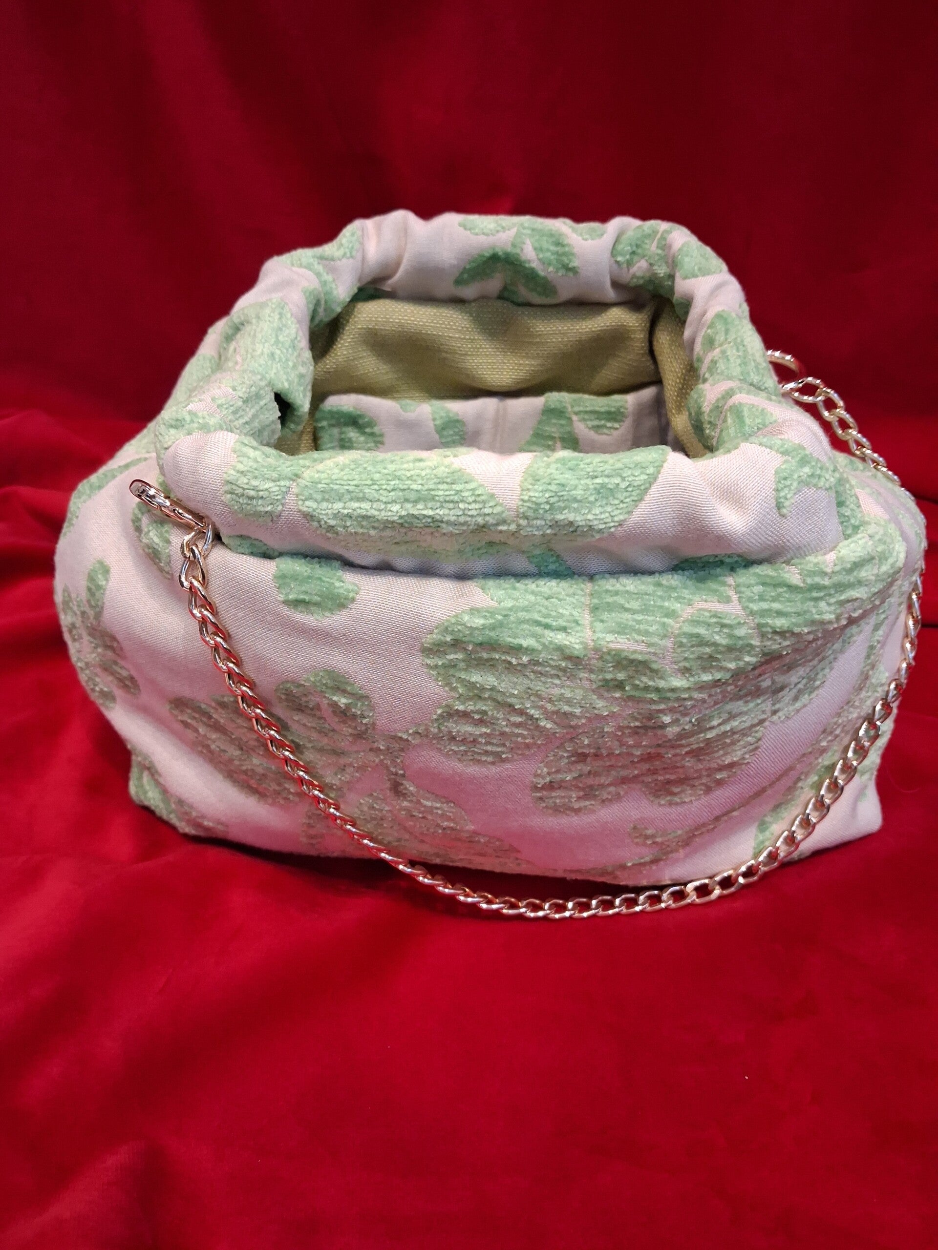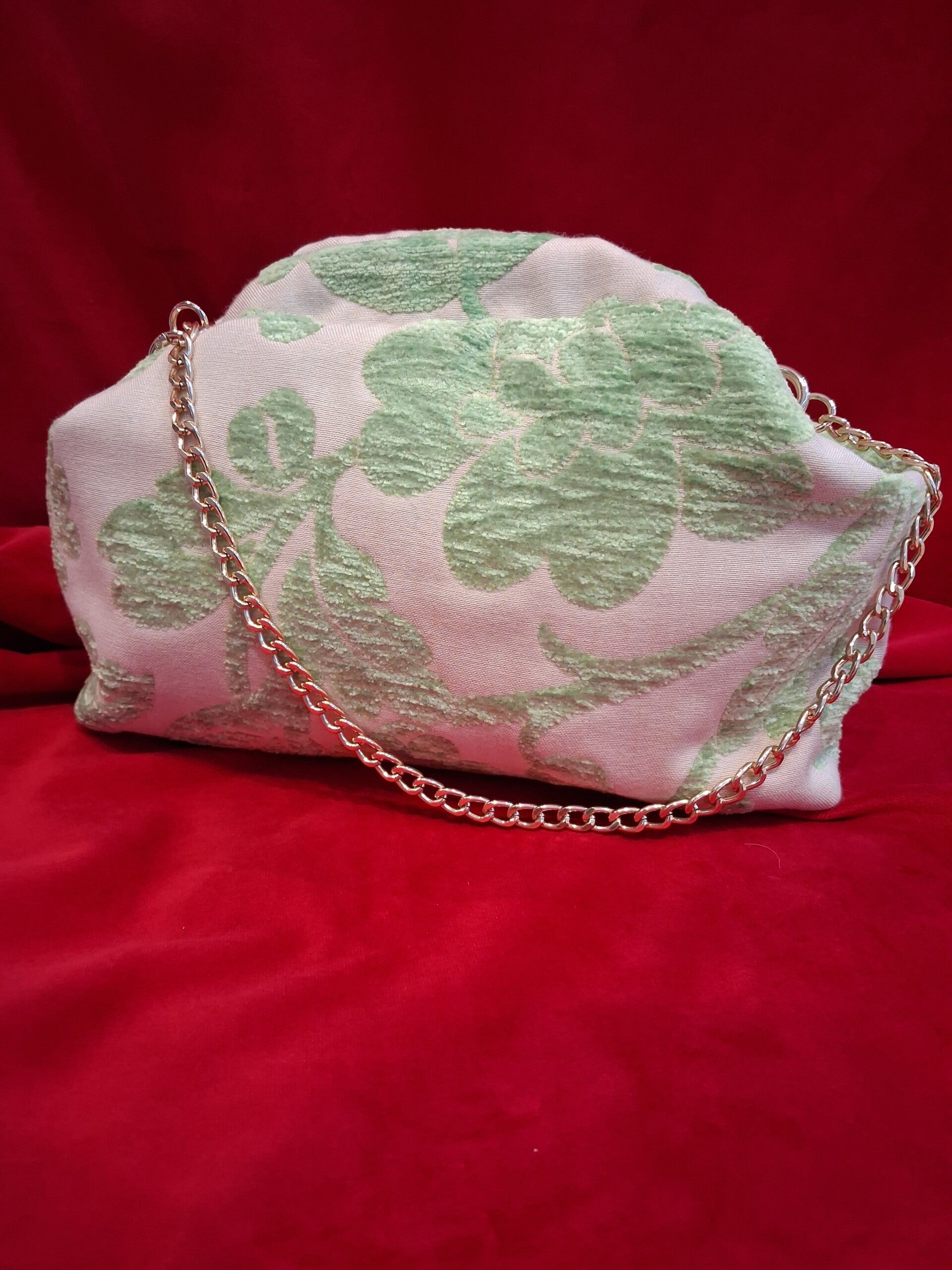 Mini pouch bag con dettagli in ciniglia verde fluo su base avorio.