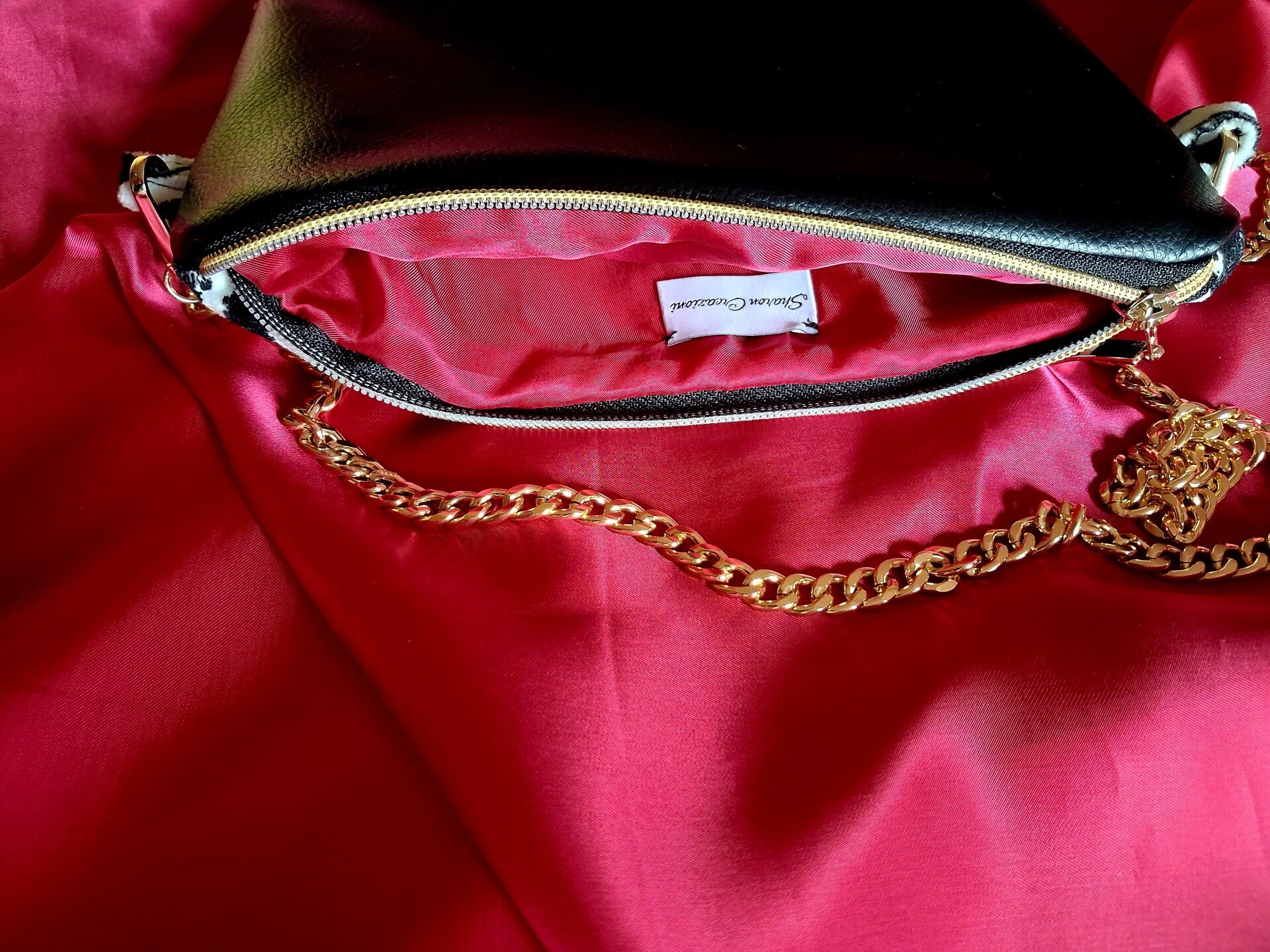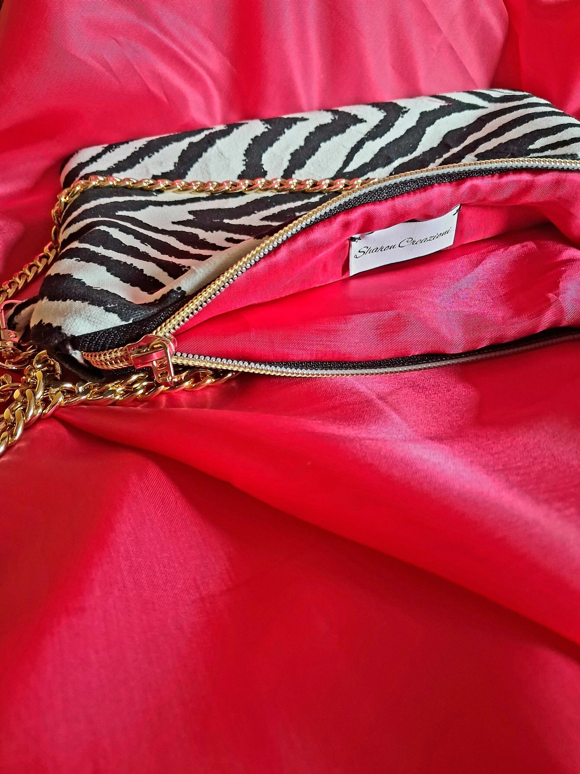 Dotata di una tracolla in catenella (lunghezza 120 cm) con moschettoni removibile, può essere indossata sia di giorno che di sera. Portata comodamente a spalla o a tracolla o semplicemente a mano.