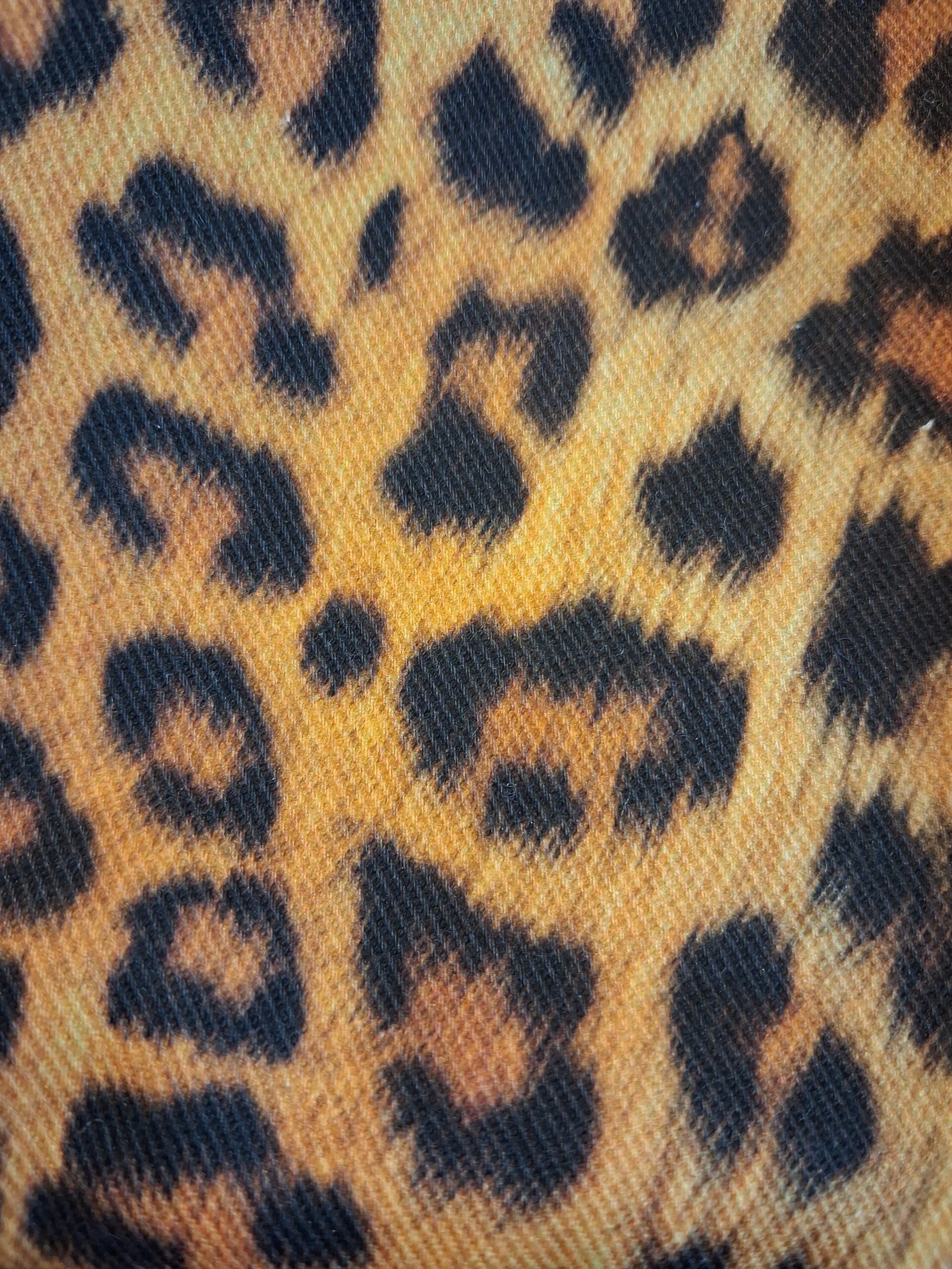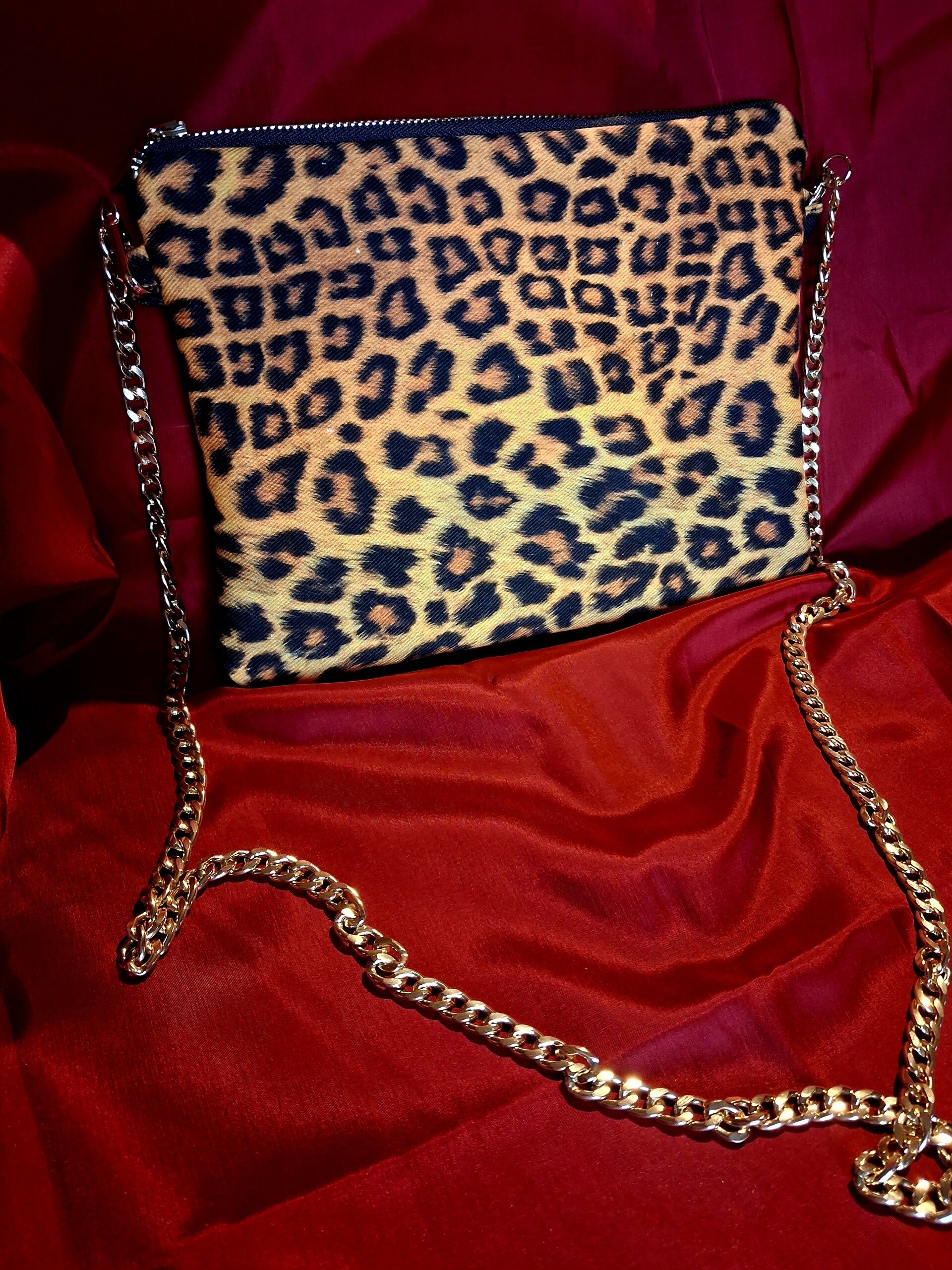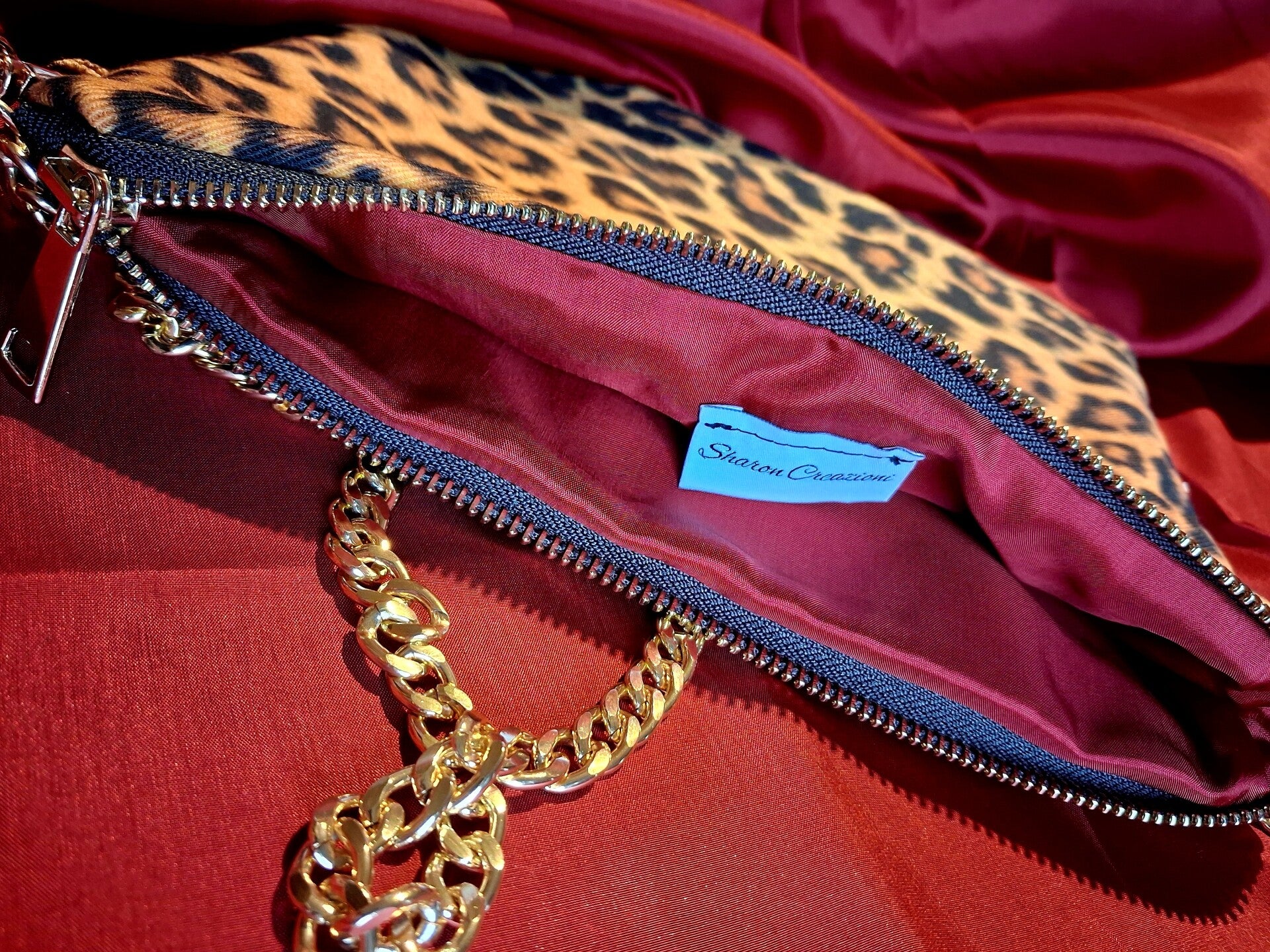 Splendida pochette in tessuto maculato in tonalità molto calde , ambrate stampato su jeans.